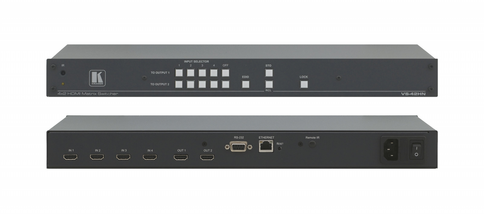 - Front panel, IR Remote, RS-232 (K-Router™ Windows®-based software is included) & Ethernet (Windows®-based Ethernet Configuration Manager & Virtual Serial Port Manager is included).