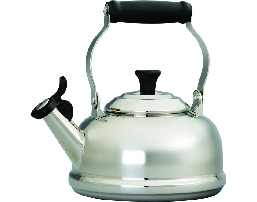 Just like its more traditional enameled counterpart, the stainless steel Classic Whistling Kettle features a wide base for quick heating, a locking handle and a comfortable grip for steady pouring. It's even compatible with induction cooktops.
