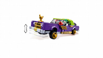 - The Notorious Lowrider features a minifigure cockpit with stereo element, bouncing suspension function, opening trunk with hidden double spring-loaded shooters and storage space, handles for Harley Quinn to hang onto, golden-colored chicken ornament on the hood, spare wheel and a comedy horn.