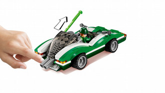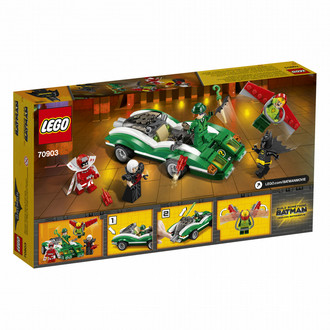 - The Riddle Racer features a dual exhaust with two flip-up, spring-loaded shooters, secret front compartment with two hidden guns, an open minifigure cockpit, plus wing mirror and translucent headlight/indicator light-style elements.