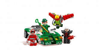 The Riddler™ and Kite Man™, Magpie™ and Calendar Man™ are causing chaos at the Gotham City Energy Facility. Team up with Batman™ to take them all on! Beware of the Riddle Racer’s flip-up spring-loaded shooters. Evade the dynamite thrown by Magpie. Dodge Kite Man's swoops from the sky. Then fight back with Batman's Batarang and capture those Super-Villains!