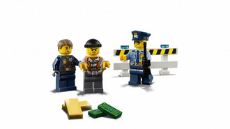 - Accessory elements include a walkie-talkie, handcuffs, two gold bars, two money bills, plus a buildable barrier.