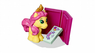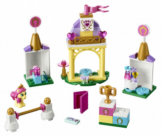 Hang out with Disney Belle's pony, Petite, at her Royal Stable! Win the show jumping trophy and present it to her on the podium. Then it's time to relax with a cup of tea and a good book… but not for long. Petite has been invited to a celebratory tea party—use the shampoo bottles to pamper her until she's ready to go.
