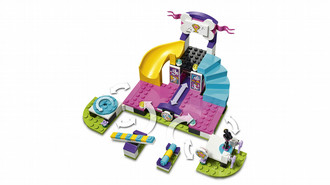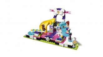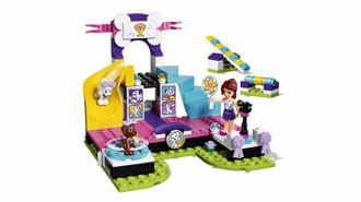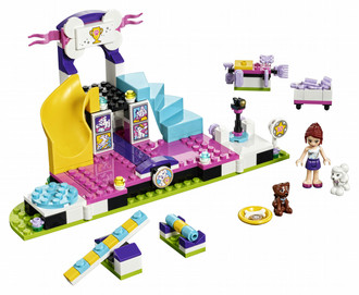 Join Mia and her puppies for a LEGO® Friends dog show. With grand entrance doors, a revolving turntable, agility seesaw and a jump with knockable bar, the dogs can show off their skills all day long. There are steps up to a judging platform and a fun slide, microphone, and grooming and feeding stations. Includes a mini-doll figure, plus two dog figures.