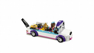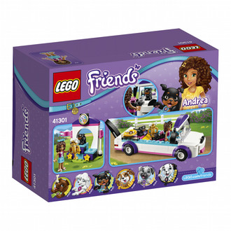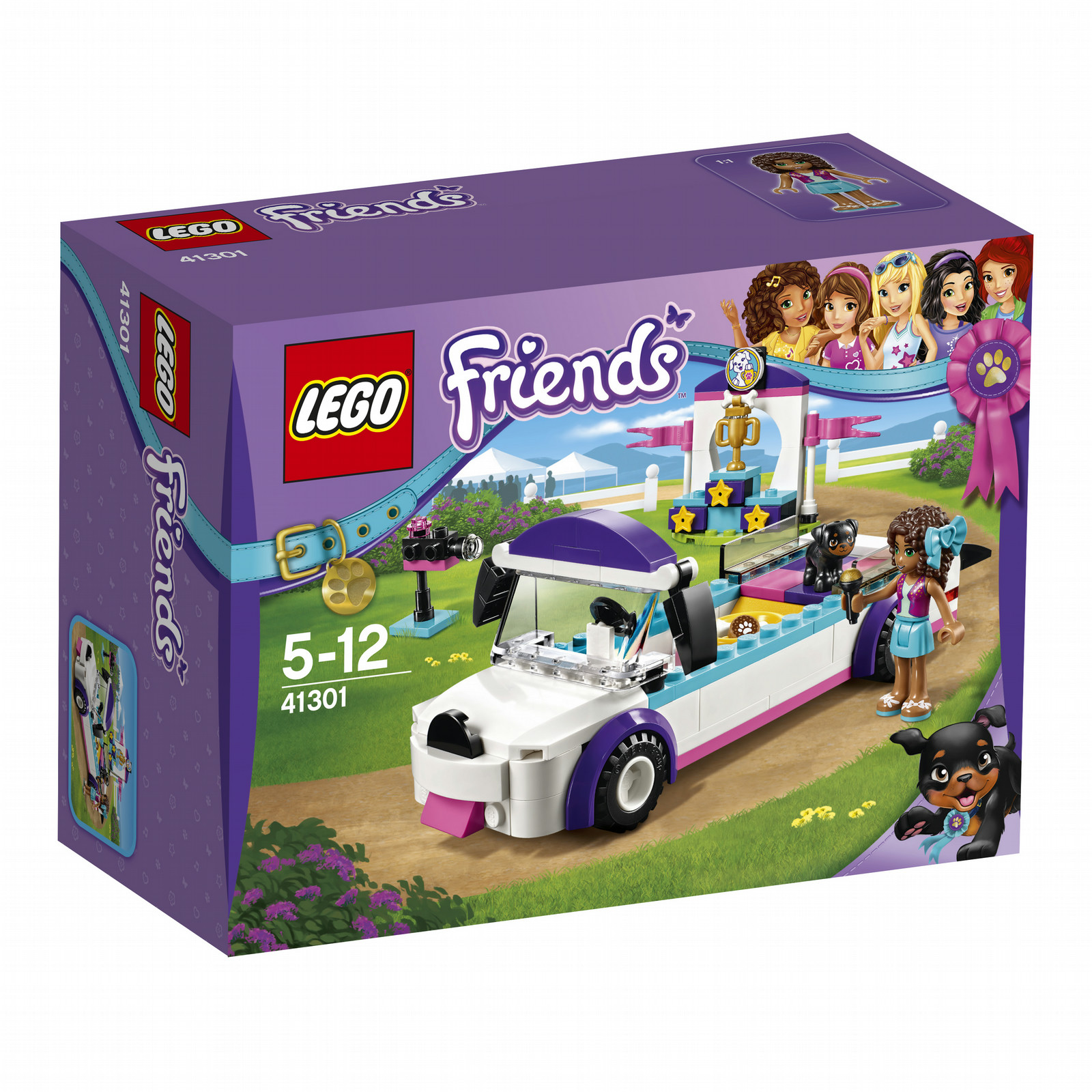Drive the Puppy Parade limo, with its cute doggy features and space inside for all of the LEGO® Friends puppies you’ve collected. Arrive at the podium to award Apollo with the golden puppy trophy, and catch it all on the TV camera with Andrea presenting on the microphone. Includes a mini-doll figure plus a dog figure.