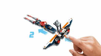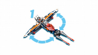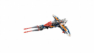 - Lance’s Twin Jouster features flip-out wings with four flick missiles, detachable Wing Jet Pack with shield holder, two minifigure cockpits, exhaust and two detachable lances.