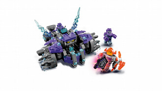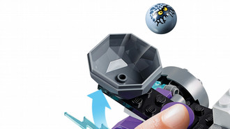 - Features a flexible-wheeled monster vehicle with giant face, two-minifigure cockpit, opening jaws, rear firing catapult, two translucent-blue lightning elements and a shield holder.