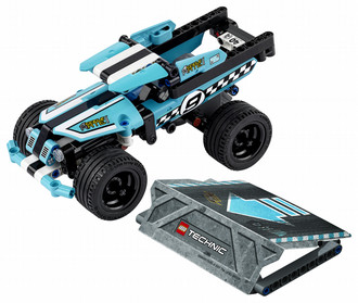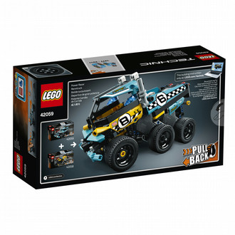 Perform amazing stunts with this high-speed LEGO® Technic Stunt Truck model, featuring a blue, black and white colour scheme with checkered racing stickers, sturdy front bumper and wide blue rims with low profile tires. This Stunt Truck is also equipped with a pull-back motor, and comes with a buildable stunt ramp. Combine with the 42058 Stunt Bike pull-back model for extended play possibilities or to create the Power Racer combi model.