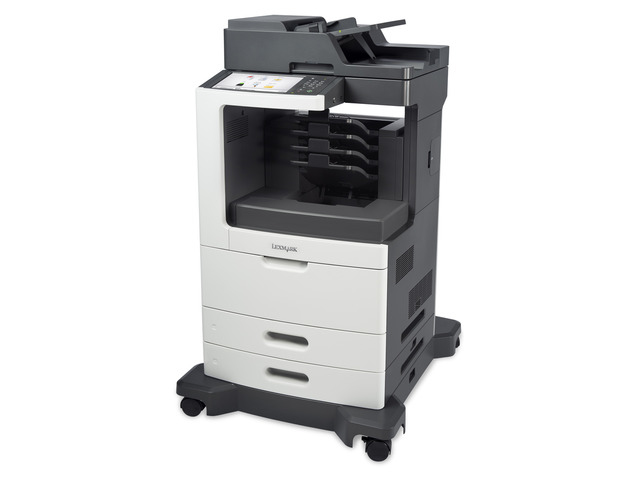 The Lexmark MX810dme MFP with a customizable e-Task touch screen, 4-bin mailbox, 1,200-sheet standard input, 1GB of standard memory and 320+GB hard disk provides print, copy, fax, scan and email functions.