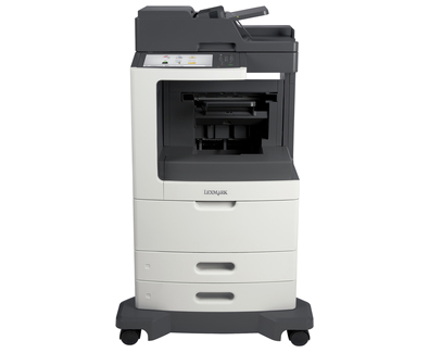 The Lexmark MX812dfe MFP with a customizable e-Task touch screen provides print, copy, fax, scan and email functions. Included are a staple finisher, 1,200-sheet standard input, 1GB of standard memory and a 320+GB hard disk