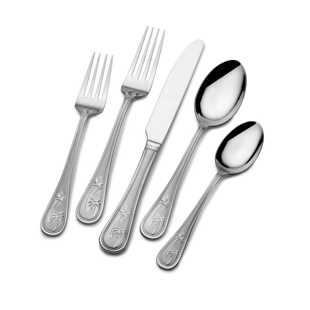 Palm Breeze 20 Piece Flatware Set Palm Breeze Flatwware, by Towle Everyday, features a whimsical palm tree motif on each handle that will add a tropical island feel to your table. Crafted of 18/0 stainless steel, this set will stand up to the rigors of everyday use. Dishwasher safe. 20 piece set, service for four, includes (4) each: dinner fork, salad fork, dinner knife, dinner spoon and teaspoon.