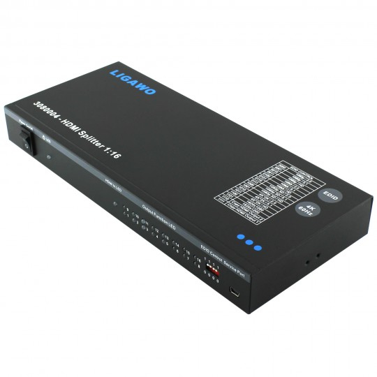 Ligawo 3080004 HDMI Splitter 1x16. Video port type: HDMI. Supported video modes: 720p, 1080p, 2160p. Colour of product: Black. Input voltage: 100-240, Input current: 2.5, Output voltage: 12 V. Dimensions (WxDxH): 115 x 265 x 38 mm, Weight: 936 g