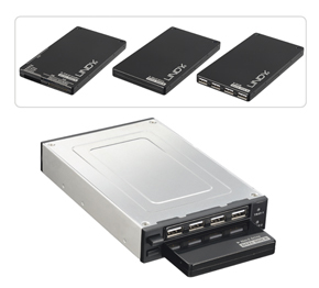 The Data Dock consists of the dock itself, which fits into a standard 3.5" expansion bay, and 3 data trays: USB Hub, Card Reader and Drive Housing. The trays simply slide into the Data Dock and connect via an internal USB 2.0 interface. Each tray can also be used 'stand alone' connected to an external USB 2.0 port.