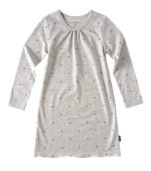 Long sleeved nighty for girls in grey melange with cool pink all-over-hearts print.