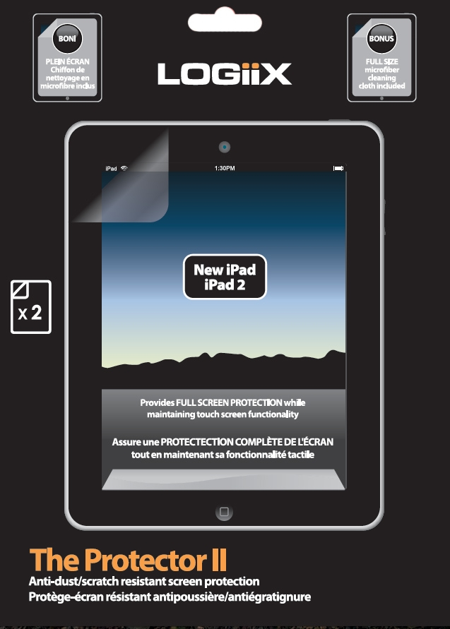 The Protector II from Logiix guards the iPad 2/New iPad against scratching and gathering fingerprints or dust. In addition to 2 premium protective films for the front screen, the package includes an optical grade microfiber cloth for cleaning and a soft card to remove bubbles during the application process.