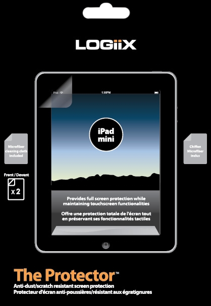 The Protector from Logiix guards the iPad Mini against scratching and gathering fingerprints or dust. In addition to 2 premium protective films for the front screen, the package includes an optical grade microfiber cloth for cleaning and a soft card to remove bubbles during the application process.