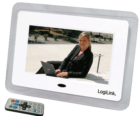LogiLink Digital 7 Inch LCD Photo Frame. Display diagonal: 17.8 cm (7"), Display resolution: 480 x 234 pixels, Display: LCD. Video formats supported: AVI, Audio formats supported: MP3,WMA. Compatible memory cards: MMC,SD,SDHC. Photo edit: Rotate. Power source type: AC