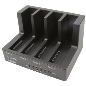 With the LogiLink docking station you can connect up to four 2.5 or 3.5 inch S-ATA hard drives to your computer without the PC open or using an external hard drive enclosure. You simply connect the included USB 3.0 cable with the computer. Now the hard drive can be inserted into the top opening of the docking station. With LED indicator for power and data flow. Pushing the eject button will disconnect the hard drive can be removed. When connecting two drives the clone feature can be used for cloning the hard drives without a PC.