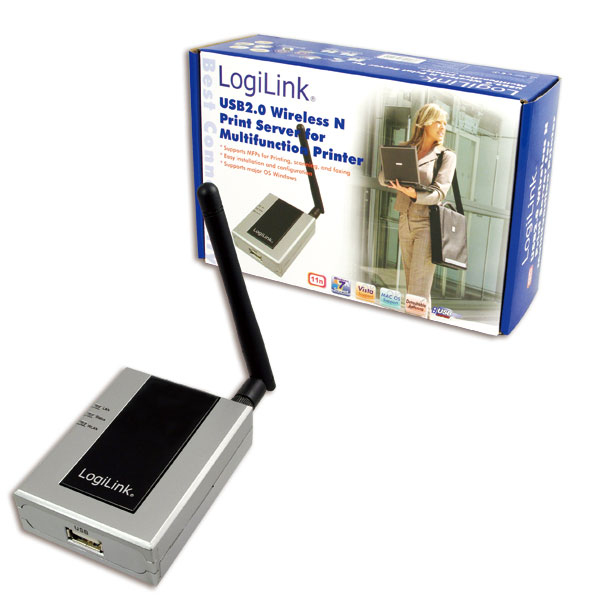 LogiLink WLAN PrintServer. Network connection type: Wireless LAN. Supported network protocols: TCP/IP, LPR, RAW AppleTalk, NetWare, SNMB, NetBeui, MAC Addressing. Security algorithms: 128-bit WEP, 64-bit WEP, WPA-PSK, WPA2-PSK. Package dimensions (WxDxH): 238 x 158 x 78 mm. Compatible operating systems: Windows 2000, XP, Vista, 7, Networking features: Fast Ethernet, Supported data transfer rates: 10/100 Mbps