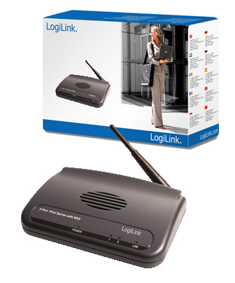 LogiLink WLAN Printserver. Network connection type: Wireless LAN, Networking standards: IEEE 802.11b, IEEE 802.11g. Security algorithms: 128-bit WEP, 64-bit WEP, WPA. Dimensions (WxDxH): 128 x 90 x 30 mm, Networking features: Fast Ethernet, Supported data transfer rates: 10/100 Mbps