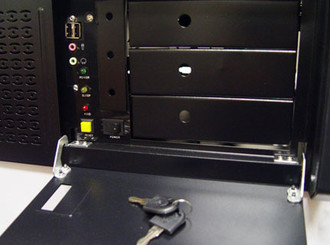Power and reset switches are in the front for easy access with a lockable cover to protect it from accidental touch . Also, the front panel has LED indicators for power and HDD, plus 2 USB ports and audio jacks for quick connection to external devices.
