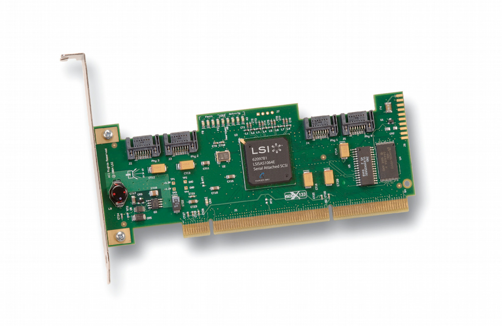 The LSI SAS 3041X-R is a low-cost four-port 3Gb/s internal SAS/SATA host bus adapter. This card offers dynamic SAS functionality including dual-port drive redundancy and SATA compatibility. The SAS3041X-R also offers Integrated RAID 0, 1, 1E and 10E for high-performance data protection, making it perfect for medium capacity internal storage applications.