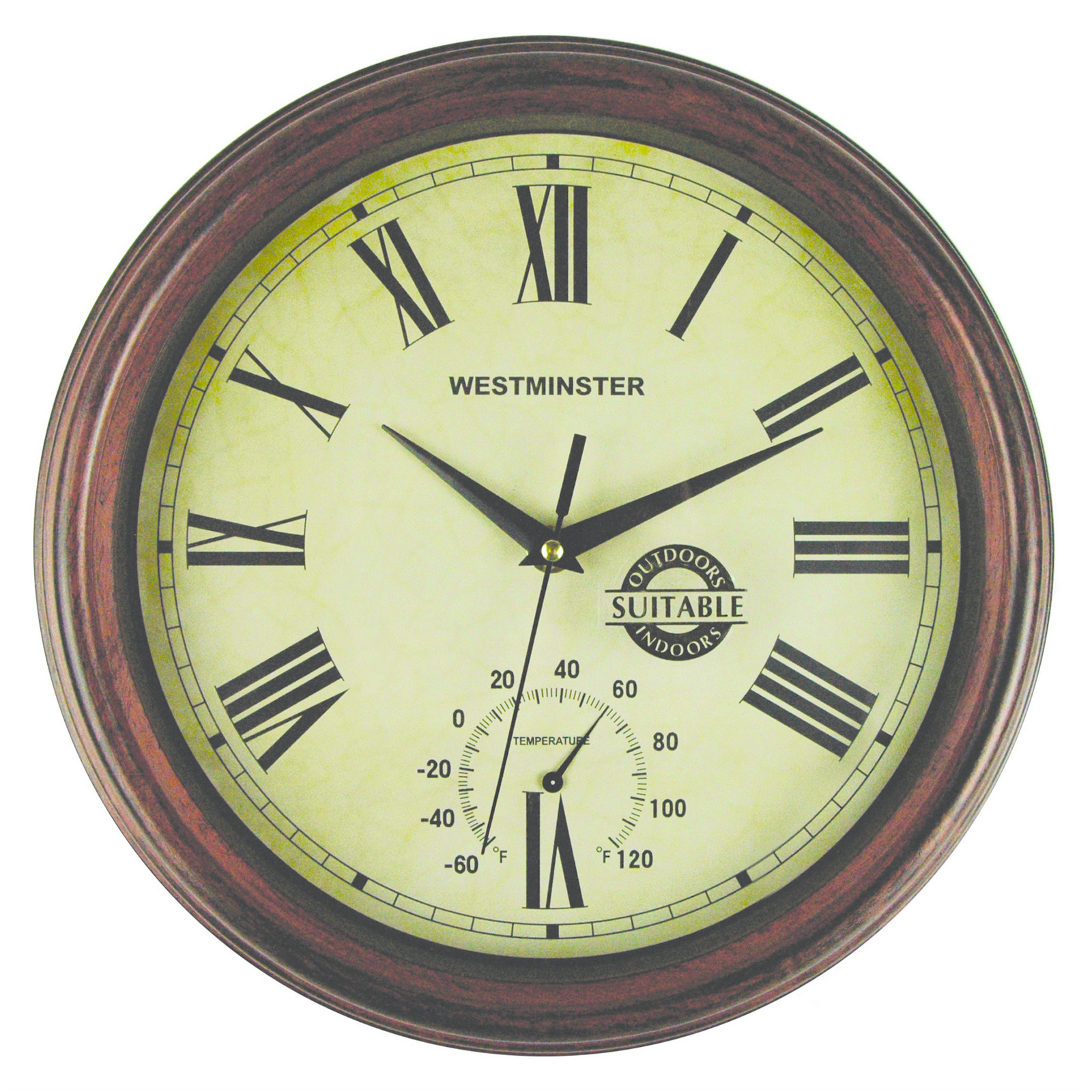Wood - look poly resin framed clock includes thermometer and second hand. A Glass lens covers the parchment colored face that features Roman numerals on the clock and English numerals on the thermometer. 12" diameter