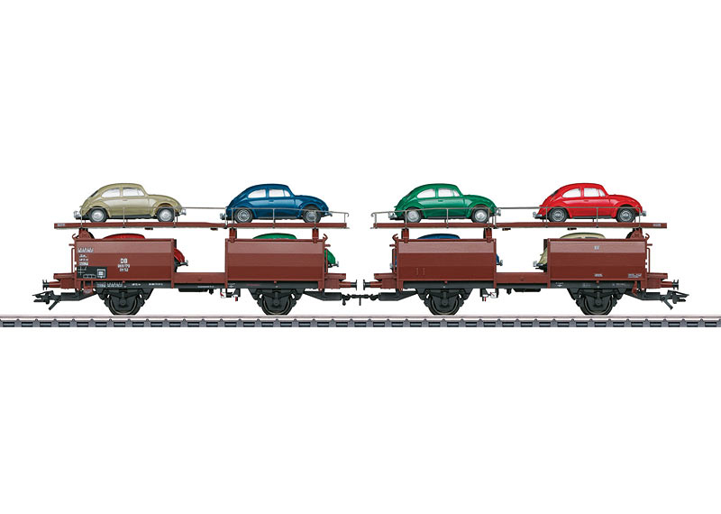 Model: There is a permanent close coupling between the car halves. The upper deck can be lowered. The cars have new car numbers. The cars are loaded with 8 different models of the VW Beetle from the firm Brekina. Suitable chock blocks are included. Length over the buffers 25.3 cm / 9-15/16". DC wheel set E700580.