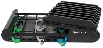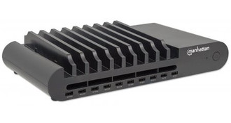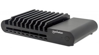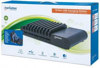 USB portable electronics place heavy demands on their batteries for power, but the Manhattan 10 Port USB Charging Station can help keep your tablets, mobile phones, digital cameras and other devices charged and ready to go. The 10 Port USB Charging Station plugs into any standard wall outlet and offers rapid charging for your portable devices via 10 USB charging ports. (The first eight ports each support 2.1-amp charging and the other two support 1-amp charging.) Advanced built-in circuitry helps avoid overcharging and short-circuiting that can damage and reduce the life of batteries and devices. The Manhattan 10 Port USB Charging Station is perfect for home, school and office use. It features 10 wide bays for securing most devices — with cases — while charging, and its convenient under-mounted bays store charging cables, keeping the countertop clean and clutter free.