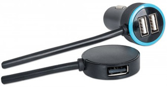 The Manhattan PopCharge Auto Passenger is a fast charging adapter that uses a vehicle's auxiliary power port to keep mobile devices charged and ready while on the road. It features two USB ports at the charger and two additional ports at the end of the 1m (3-ft.) extension cable for charging passengers' devices. Capable of fast charging two tablets*, smartphones*, digital cameras, music players and more, or charging four devices simultaneously. A built-in surge protection system guards connected equipment from unexpected vehicle power fluctuations, and spring-loaded contacts ensure a good, reliable connection.