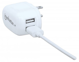 USB portable electronics place heavy demands on their batteries for power, but the Manhattan PopCharge Home can help keep your tablets, mobile phones, digital cameras and other devices charged and ready to go. The PopCharge Home plugs into any standard wall outlet and offers rapid charging for your portable devices via two USB charging ports (1 amp per port when two devices are charging; 2.1 amps when one device is charging). Advanced built-in circuitry helps avoid overcharging and short-circuiting that can damage and reduce the life of batteries and devices. Plus, a bright LED tells you when your device is fully charged and ready to use.