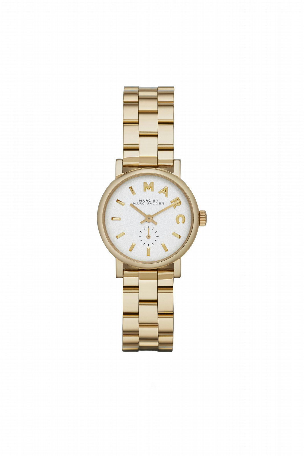 The Baker watch features classic, understated Marc by Marc Jacobs styling in a polished stainless steel watch with gold tone finish, round 28MM snapback case, and deployant buckle closure. White Pearlized dial with elegant gold tone 'Marc' logo, separate seconds dial, and beveled sticks & hands.