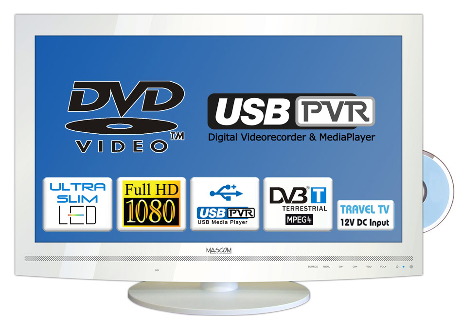 Mascom MC24LFH44USBW. Display diagonal: 61 cm (24"), HD type: Full HD, Display resolution: 1920 x 1080 pixels. Analog signal format system: PAL,SECAM B/G,SECAM D/K,SECAM L, Digital signal format system: DVB-T, Tuner type: Analog & digital. RMS rated power: 20 W. Teletext: 1000 pages, Video formats supported: AVI,DIVX,MPEG4, Audio formats supported: MP3,WMA. Colour of product: White
