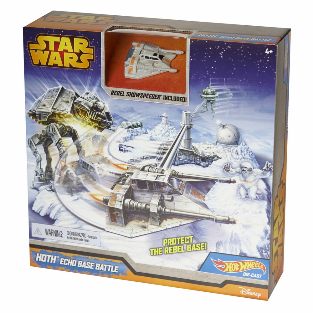 Kids will love re-creating the epic battle from "Star Wars: Episode V The Empire Strikes Back" on the snowy planet of Hoth™. Send the Hot Wheels® Snowspeeder Starship flying across the icy terrain to defend the Rebels' Echo Base from the Empire.