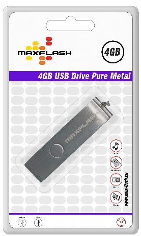 MaxFlash 4GB USB 2.0. USB version: USB 2.0, USB connector: Type-A. Form factor: Swivel, Colour of product: Silver. Package type: Blister. Package dimensions (WxDxH): 95 x 165 x 20 mm