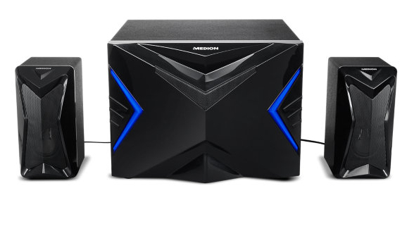 Medion ERAZER X89015 2.1. Audio output channels: 2.1, RMS rated power: 36 W. Satellite speakers RMS power: 18 W. Subwoofer RMS power: 18 W. Power source: AC. Satellite speaker dimensions (WxDxH): 140 x 100 x 300 mm, Satellite speaker weight: 755 g, Subwoofer dimensions (WxDxH): 230 x 240 x 320 mm