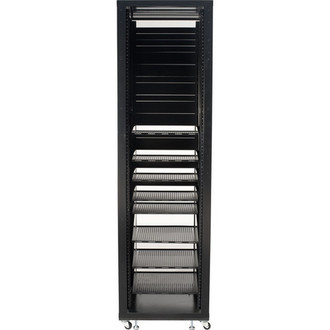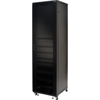 The SANUS Foundations Component Series CFR144 AV rack solution comes fully loaded to simplify ordering, offering the ultimate in quality and flexibility. This sturdy rack offers up to 44U of space, including five 1U shelves, three 3U shelves, eleven 1U blanking panels and eight 2U blanking panels for up to 1,000 lbs of AV gear. The rack features heavy-gauge welded steel construction, adjustable feet for easy leveling and swivel casters for 360º access. A unique convection cooling system keeps AV gear at the proper temperature by allowing heated air to escape through the top as cooler air is drawn in through the bottom. Wires stay organized with the CFR144's three section back panel that features wire management openings and removable panels. A lockable tempered-glass door with a quarter-turn handle provides security while maintaining component visibility.