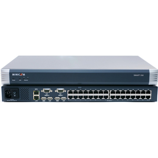The Smart 232 is a thin 1U sized, rack-mountable device that saves critical space in crowded server room environments. It features Minicom KVM over CAT5 technology that directly connects the switch to each computer in the server room via a RICC/ROC dongle, eliminating cable clutter and extending the distance between server and switch up to 30m/100ft.