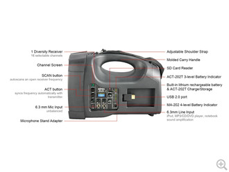 - Convenient storage compartment and battery charger for ACT-202T handheld microphone.