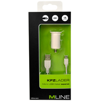 MLINE HMICROUSB3004WH. Charger type: Auto, Charger compatibility: Universal, Power source type: USB. Colour of product: White. Input voltage: 12 - 24, Output current: 1000 mA. Cables included: Micro-USB