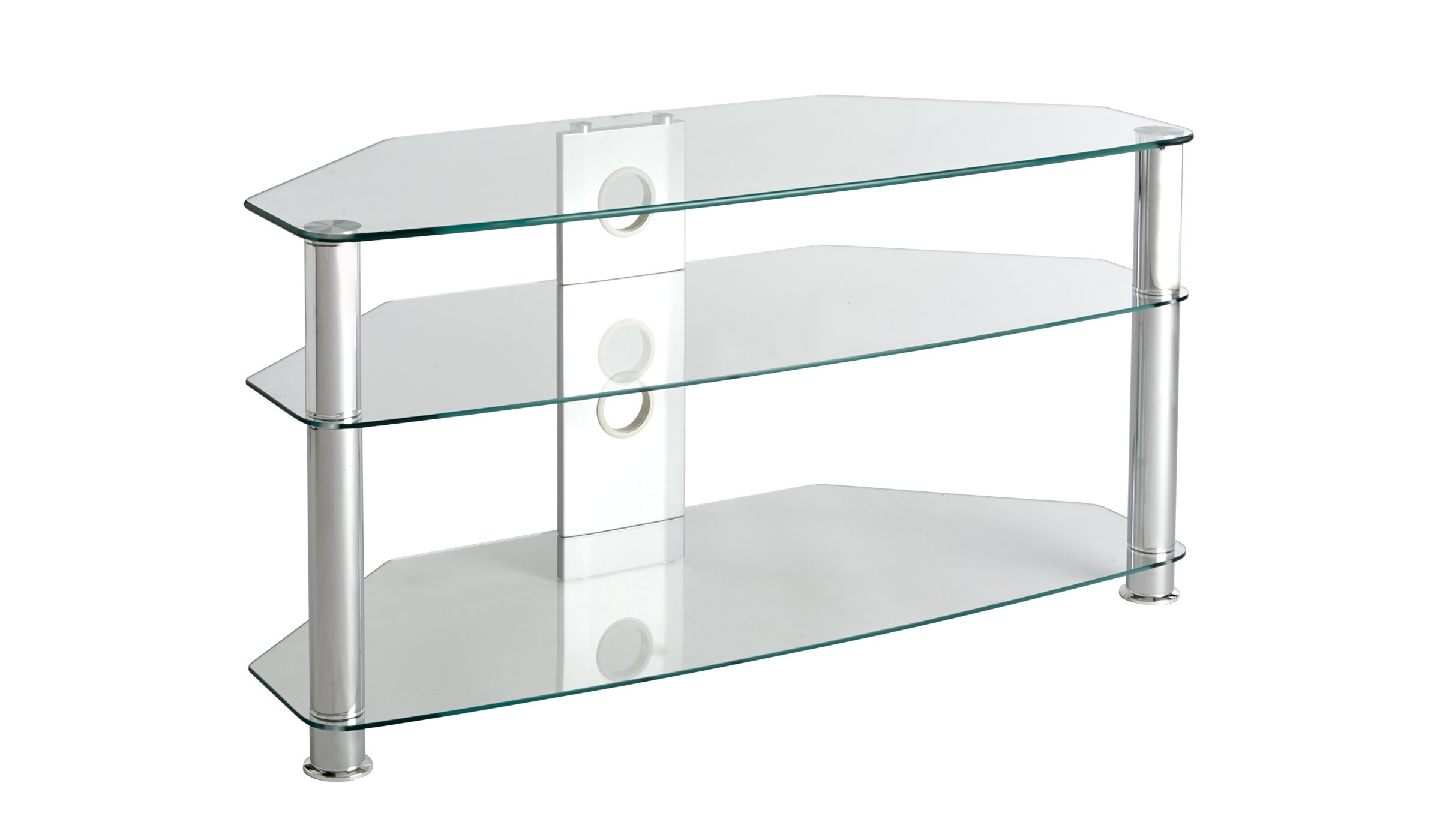 The MMT-CL1000 clear glass corner TV stand offers great style and value, with the high gloss chrome steel legs that really enhance the quality look and appeal of the unit. Designed as a corner TV stand this modern classic now comes with a radius curved glass front and tapered cut away sides to enable the unit to fit in to a corner of a room.