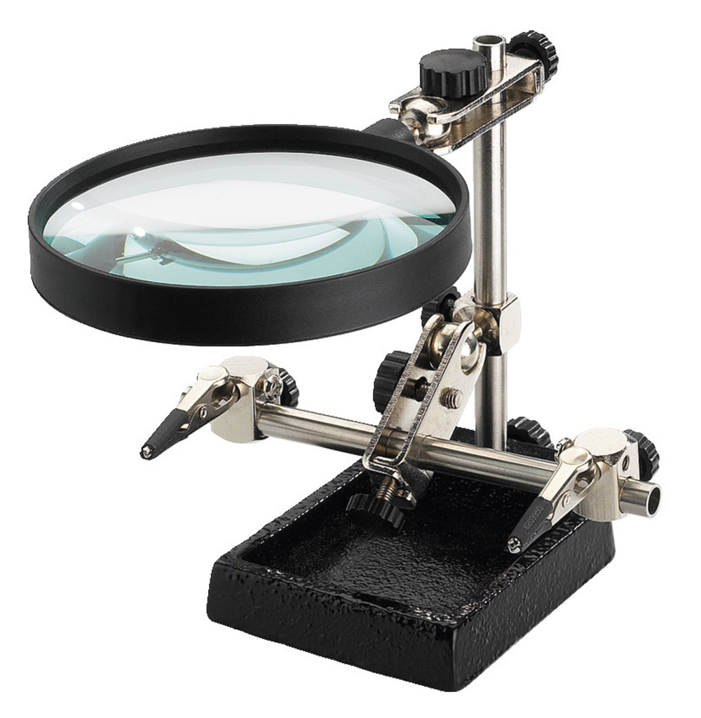 - Adjustable, ball joints - Universal double clip holder - Magnifying glass: Ø 90 mm - Gripping width: 115 mm max. - Diecast base with storage facility for small parts