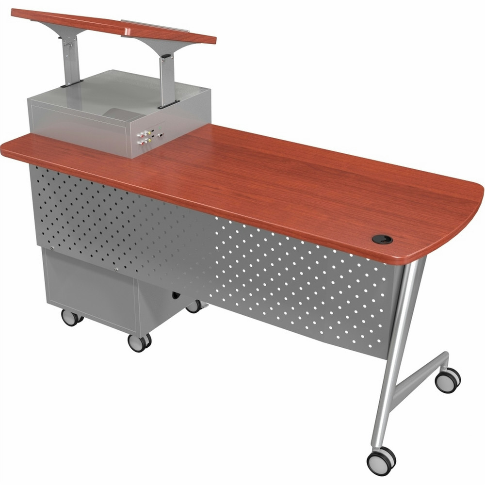 - Grommets in the desktop and podium body provide easy cable management. Frame is powdercoated steel with 3" locking non-marring casters. Perforated modesty panel and angled legs add style and function.