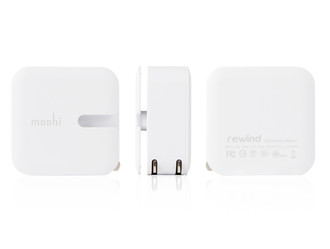 Charge two iDevices at once with Moshi's Rewind. The power adapter provides 2.1 amps of power and optimally balances capacity to both USB ports for fast and efficient charging. Rewind has advanced circuitry for overcurrent and surge protection to ensure the safety and protection of your devices. Rewind's folding plug design provides for easy storage and on-the-go portability, and its slim form factor offers minimal obstruction to adjacent outlets on most power strips. The package includes Moshi's high output dual-port Rewind power adapter.