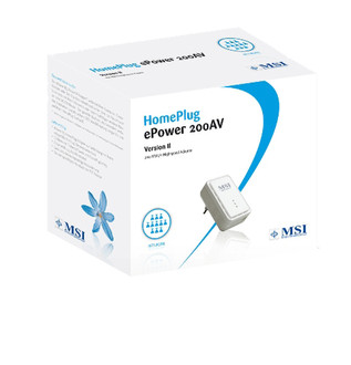 MSI MEGA ePower 200AV Version II. Connectivity technology: Wired, Host interface: Ethernet. Data transfer rate (max): 200 Mbit/s. Colour of product: White. Compliance industry standards: IEEE 802.3, IEEE 802.3U, Compatible operating systems: Windows 2000, XP, VISTA, MAC, Linux, Networking features: Fast Ethernet, HomePlug AV (HPAV)