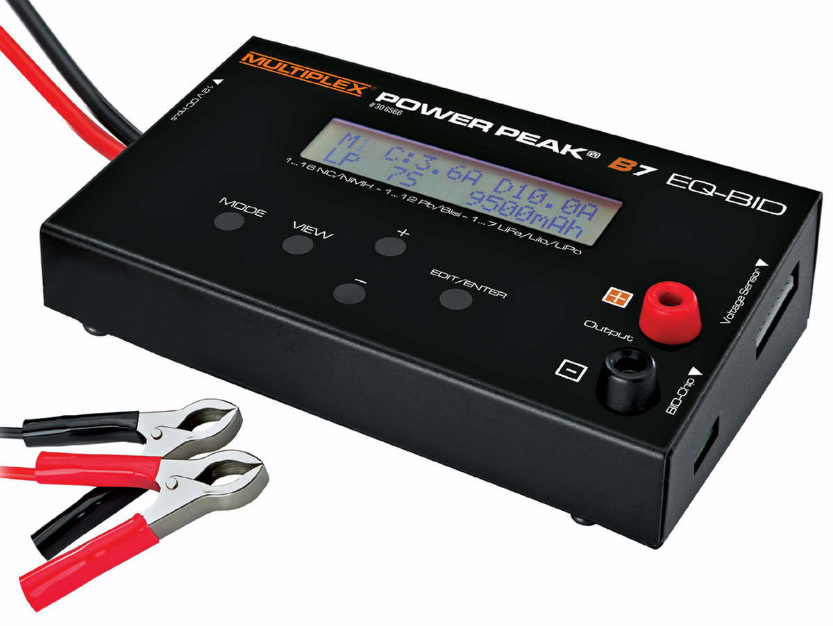 MULTIPLEX B7. Output current: 10 A, DC input voltage: 10 - 15 V. Width: 130 mm, Depth: 80 mm, Height: 35 mm. Colour of product: Black. Type: Indoor battery charger