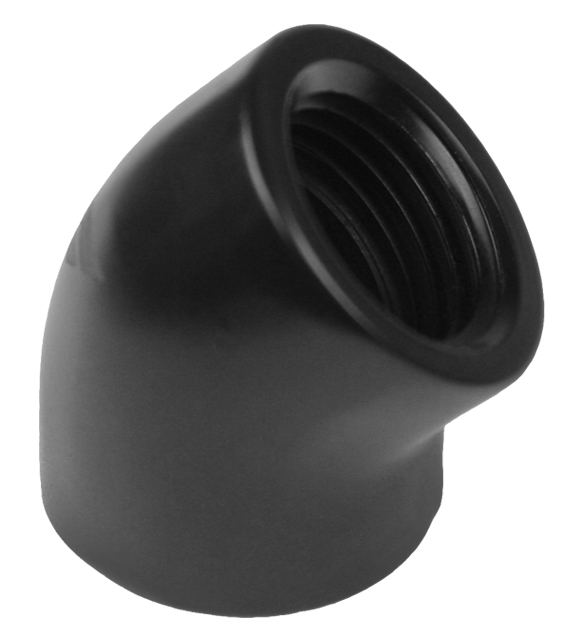 Black adaptor with two 1/4 inch inner threads; the adaptor has an angle of 45°.