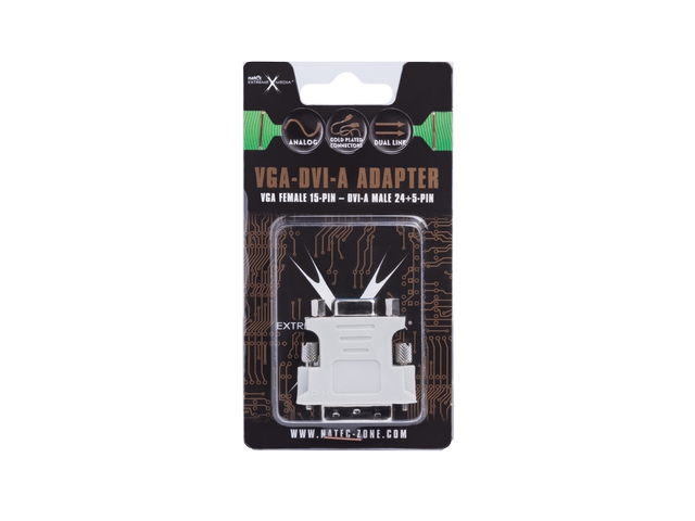 Adapter fitted with DVI-A 24-pin and VGA HD15 F connectors. Transfers only analogue data.