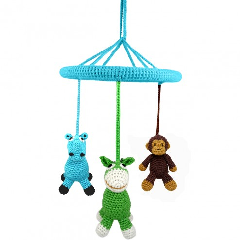 Circle Mobile - Mr. Donkey, Mr. Monkey and Sir Rhino Hand crocheted circle mobile of premium quality with many beautiful details. The animals easily turn, and when you shake them they make a soft rattle sound.