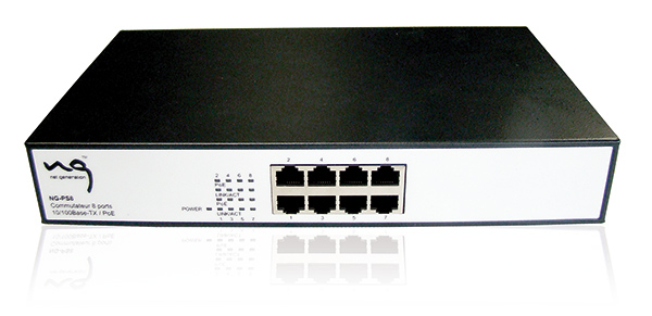 NET GENERATION NG-PS8. Basic switching RJ-45 Ethernet ports type: Fast Ethernet (10/100), Console port: RJ-45. Networking standards: IEEE 802.3, IEEE 802.3af, IEEE 802.3u, IEEE 802.3x, Cable types supported: Cat5. MAC address table: 1024 entries, Packet forwarding rate (100 Mbps): 148800 pps, Packet forwarding rate (10 Mbps): 14880 pps. Colour of product: Black, Silver, Case design: freestanding, Certification: FCC Class A, CE. Buffer size: 512 KB